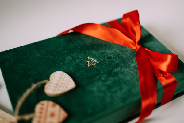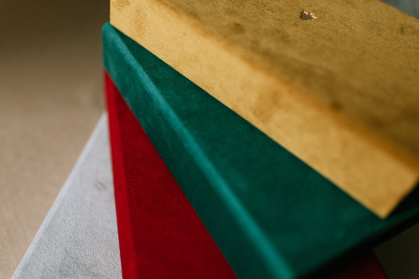 Pudełka w świątecznej ofercie są dostępne w czterech kolorach cudownego w dotyku, aksamitnego materiału Eco Velvet wraz z wytłoczoną na złoto choinką (dwa rodzaje do wyboru).
