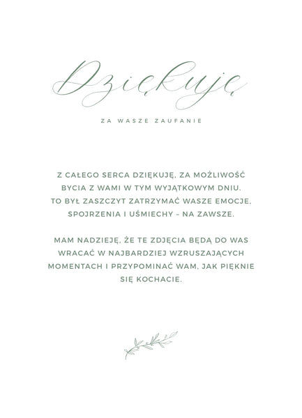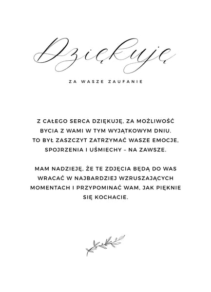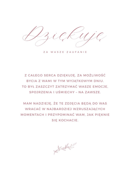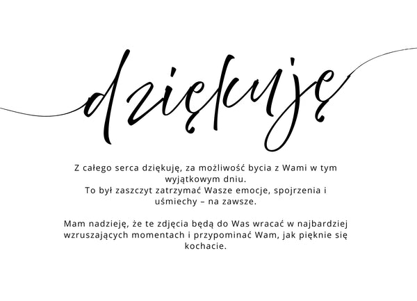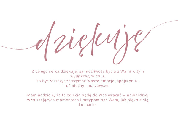 Minimalistyczne podziękowanie drukowane na matowym papierze w formacie 13x18 cm to piękny sposób, by zamknąć współpracę z klasą i wdzięcznością. Możesz je dołączyć do paczki z odbitkami lub umieścić przy fotoalbumie – niech klient poczuje się naprawdę doceniony.