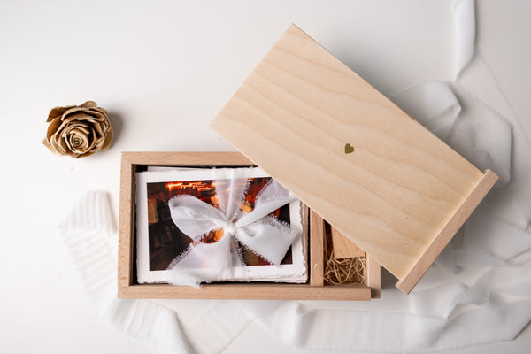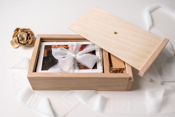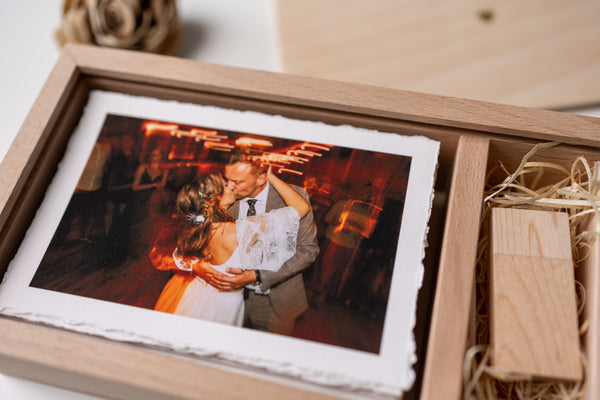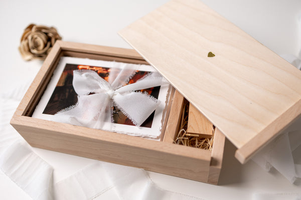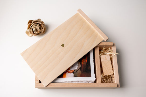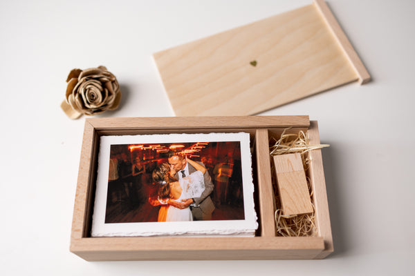 Piękne, ręcznie wykonane pudełko z naturalnego drewna to wyjątkowy sposób na przechowywanie zdjęć w formacie 10x15 cm z miejscem na USB